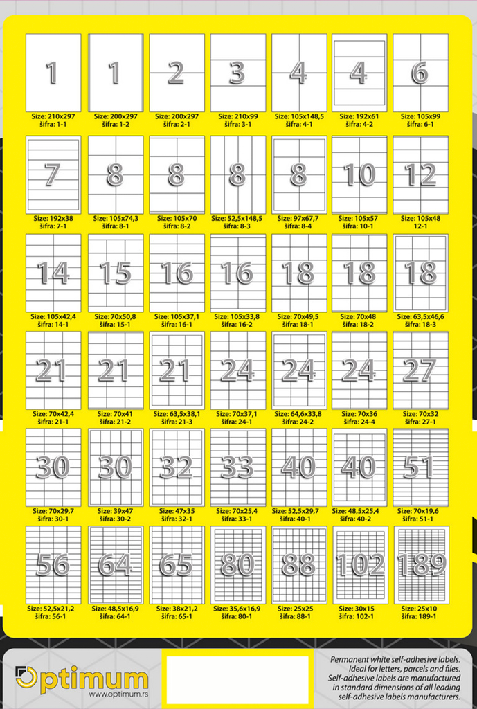 » Kancelarija » Optimum proizvodnja » Nalepnice » Proizvod: 23146-1 | NALEPNICE A4 210X148 2-1 OPTIMUM *SR